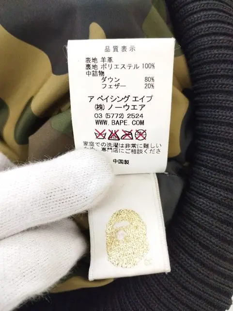 A BATHING APE アベイシングエイプ レザーダウンジャケット S ブラック 001HJ9801019 裏地カモ柄の買取金額
