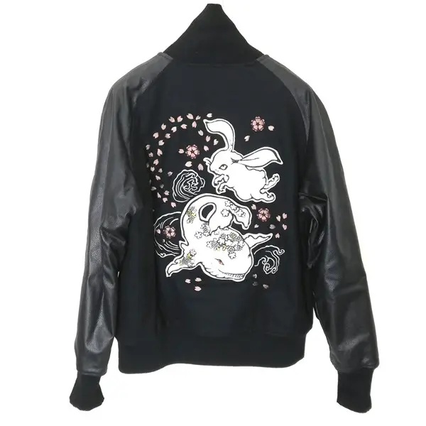 CHIKIRIYA チキリヤ 袖レザーウールスタジャン L ブラック 和柄 兎 鯨 ワッペン 刺繍 牛革