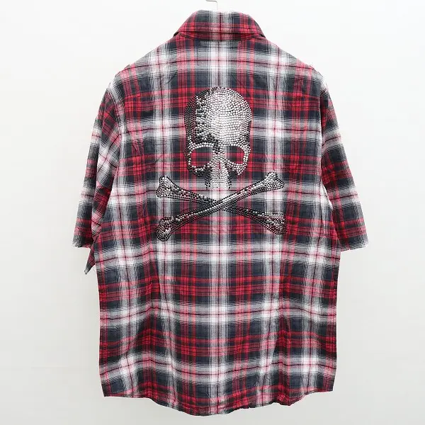 Roen ロエン 半袖 チェック柄 シャツ 50 レッド×ブラック×ホワイト スカル ライトストーン スタッズ