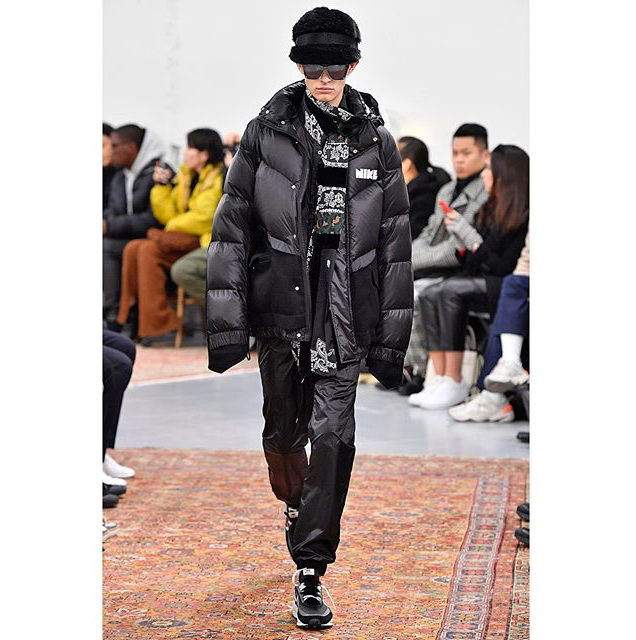 「サカイ」は、他社とのコラボレーションも積極的に行い、巧みにこなすブランドでもある。こちらの「ナイキ」とのコラボレーションによるスニーカーとダウンジャケットも、非常に目を引く存在だ。肩幅は狭めで袖丈が長く、素材の切り替えがモード感を漂わせている。スニーカー・ダウンジャケット共に、ショーではブラックとホワイトの二種類が確認された。