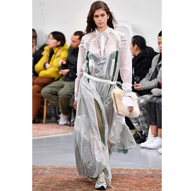「ナイキ」スニーカーは先ほど紹介した通りだが、こちらのシースルーでエスニカルなワンピースとの「ハイブリッド」も美しい。「サカイ」にとってはメンズファッションウィークのショーということは、最早あまり関係ないのだろう。ファーストルックを飾るのにふさわしい存在感を放っている。