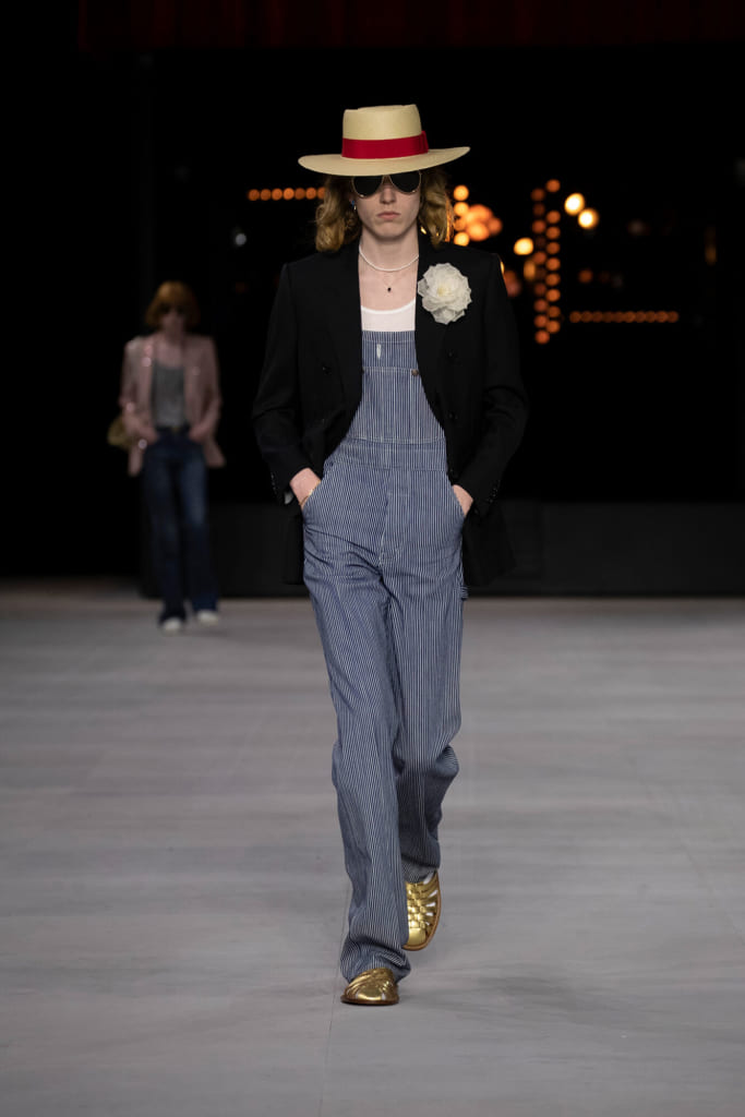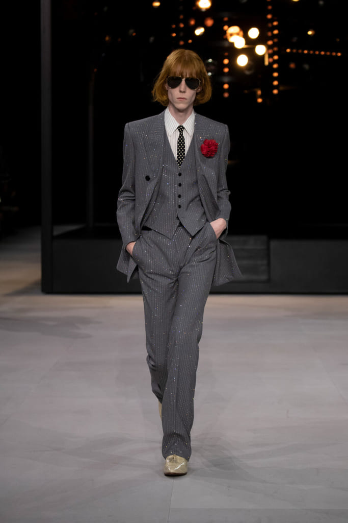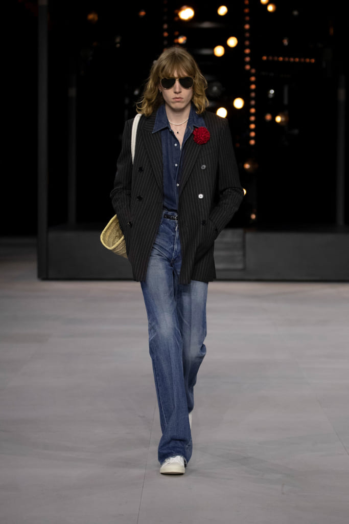 細身のスタイルやアイウェアなど、今期もエディらしさ全開である。今シーズンは裾の広がったジーンズやラメ入りのセットアップなど、さながら1970年代のロックスターのよう。加えて、随所にフレンチカジュアルの要素を取り入れ、絶妙なバランスで融合されている。