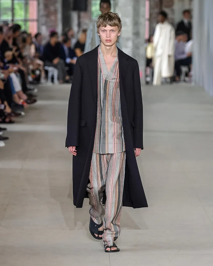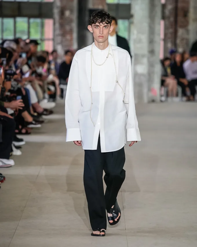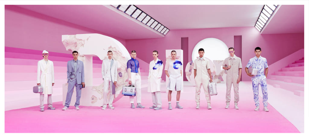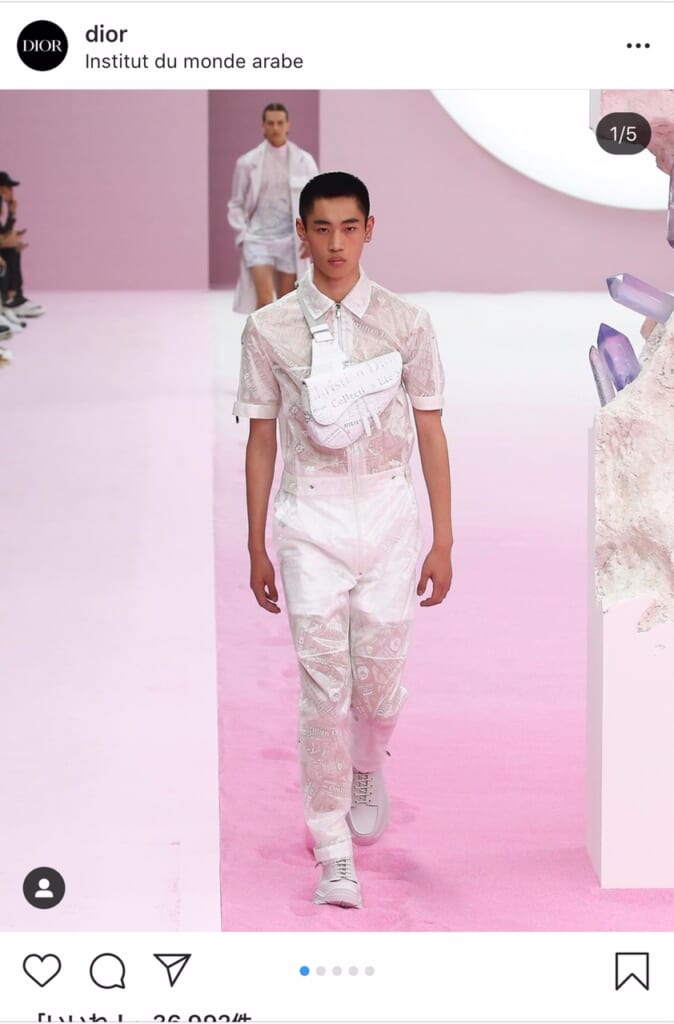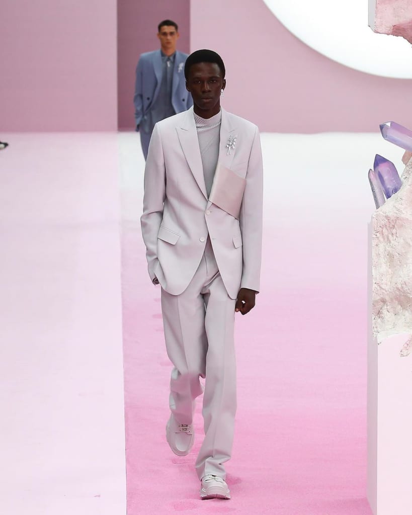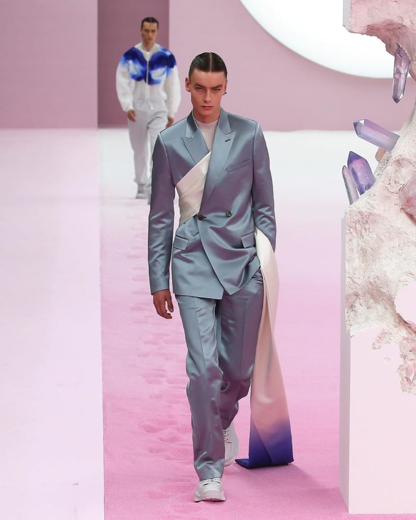 ディオールのメンズラインは、伝統的にテーラードスタイルを得意としている。クリス・ヴァン・アッシュやエディ・スリマンが手掛けていた時期も然り、それ以前の「ムッシュ」時代も然りだ。オーガンジーのシースルーアイテムや、ジャケットの光沢感のある生地感も印象的で、いずれもラグジュアリーな印象を与える。