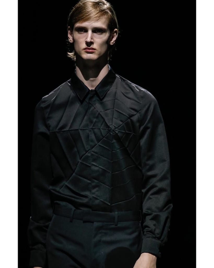 ルックのほぼすべてをテーラードジャケットやコート、シャツといったアイテムでまとめ、今期は会場だけでなく、カラーもほとんどを黒一色で展開している。これでもか、という程にダークでミニマル。異様ともいえる雰囲気を漂わせている。